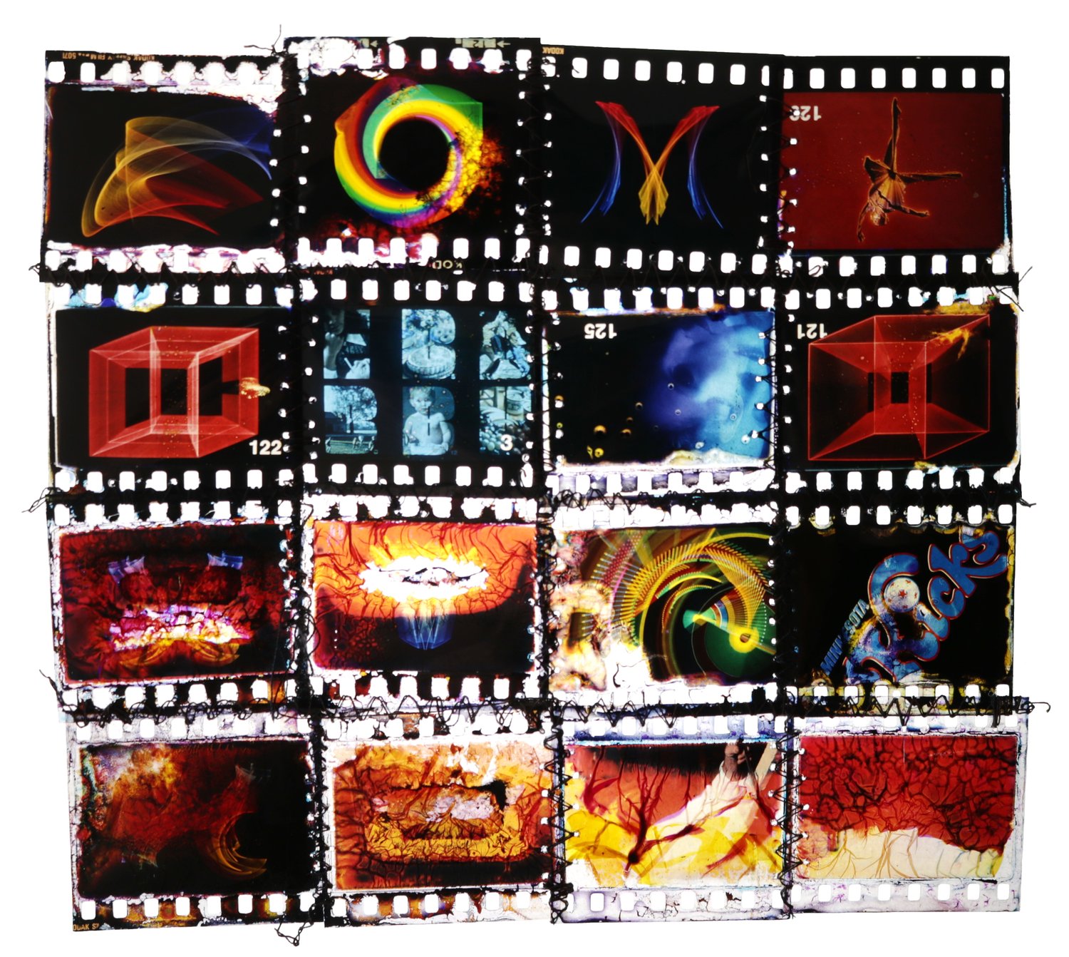 The artwork is created from slide film that was damaged in a flood and then sewn together by Ferose, transforming them into art pieces. The complete collection of 64 pieces is arranged in a quilt format and continues to be featured in art exhibitions.