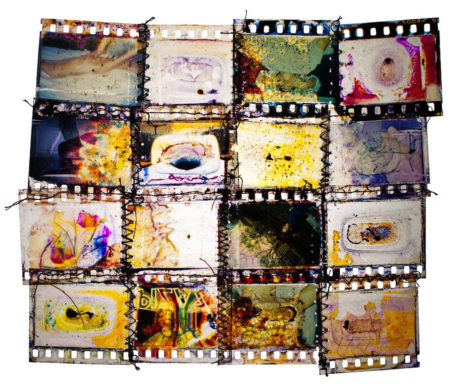 The artwork is created from slide film that was damaged in a flood and then sewn together by Ferose, transforming them into art pieces. The complete collection of 64 pieces is arranged in a quilt format and continues to be featured in art exhibitions.